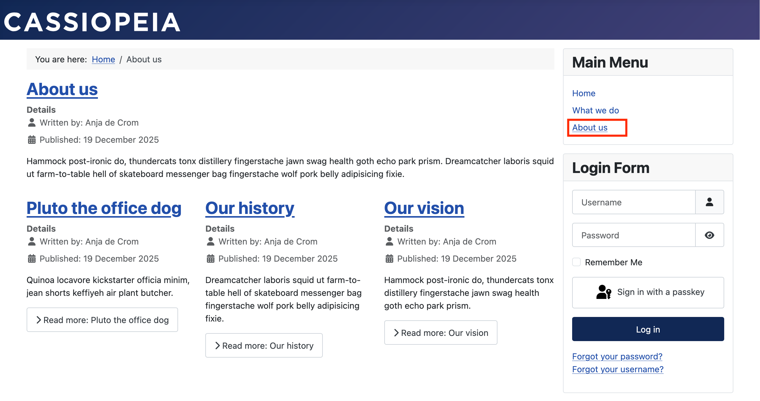 Our About us page should show one large article and three intros below it.